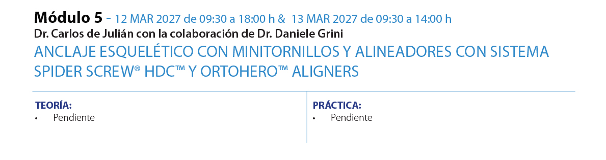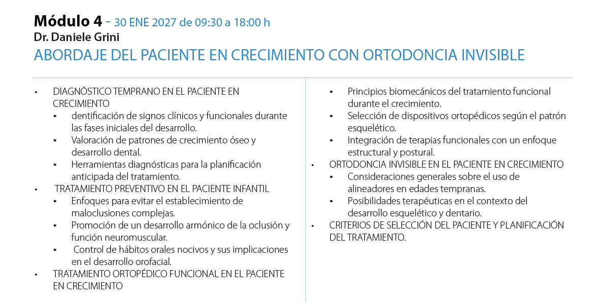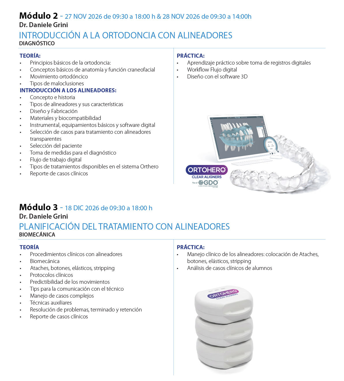 Este curso modular está enfocado fundamentalmente en la evolución actual de los tratamientos con alineadores y nuevas técnicas de hibridacion necesarias e integradas con un flujo digital de trabajo.