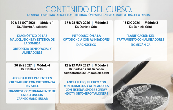 Para diferenciarte hoy día como ortodoncista, vada vez son más necesarios soluciones integrales con alineadores a múltiples casos, que nos posicionen hacia el paciente con confianza y valor añadido. En este curso modular abordamos los aspectos más importantes enfocados en la evolución actual de los tratamientos.